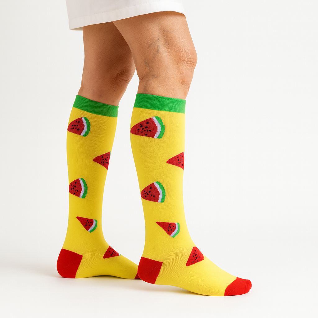Compresia® utilizza una compressione graduata mirata alla caviglia (12–15 mmHg) che decresce verso il polpaccio. Questo favorisce il ritorno venoso e riduce gonfiore e pesantezza. I nostri filati sono pensati per risultare morbidi sulla pelle, stabili durante il giorno e facili da indossare.